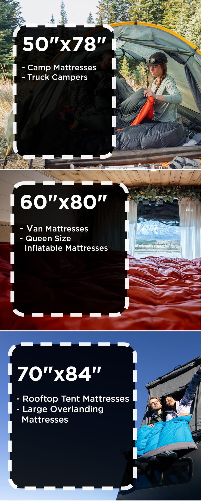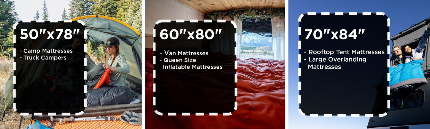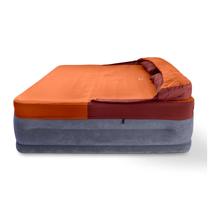 *A note on air mattresses: While Overland Double Sheets fit large inflatable air mattresses like the one pictured, these mattresses provide little to no insulation and can feel cold. To achieve the stated comfort rating of the Overland Double Bed, we recommend pairing it with a mattress rated R-value 4.5 or higher.