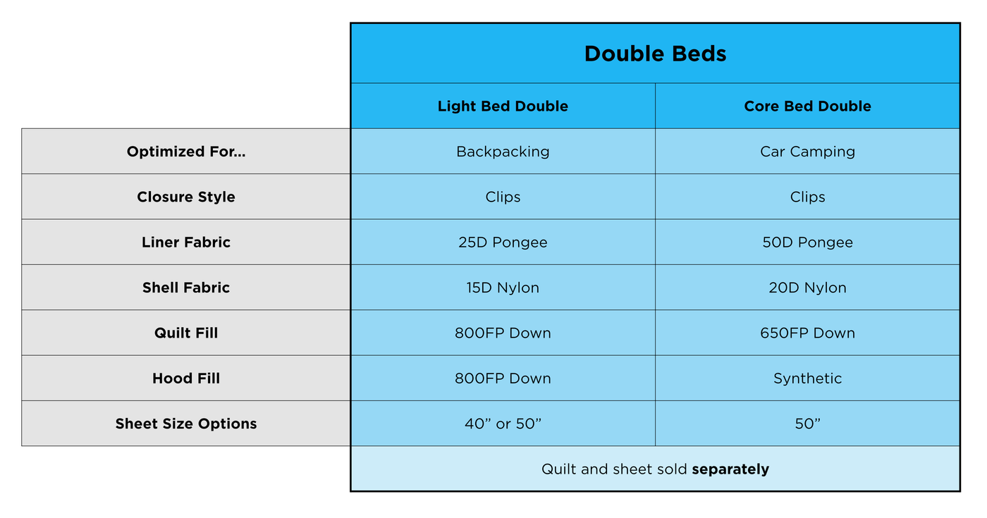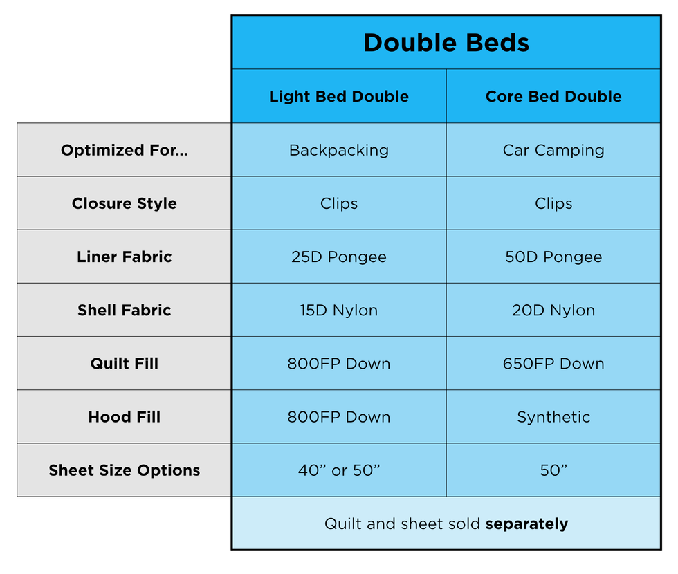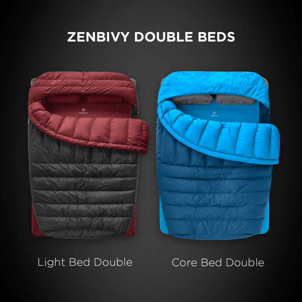 The Light Bed Double is optimised for backpacking, so it compresses down smaller than the Core Bed Double and weighs 510g to 560g less, depending on the size.