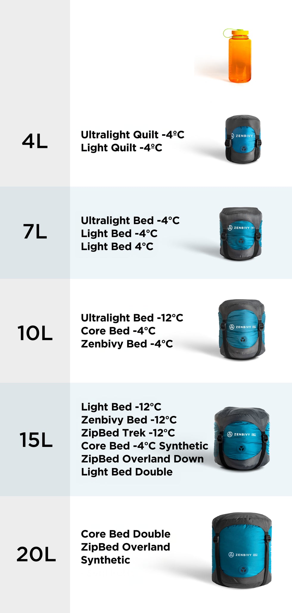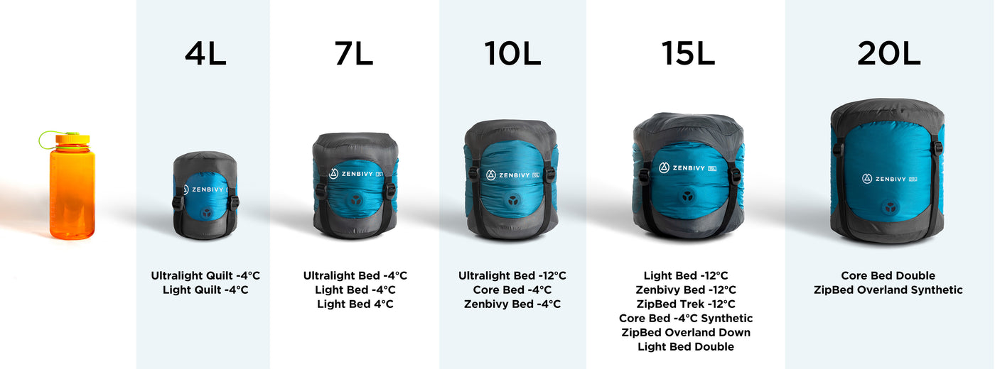 Both the quilt and sheet will fit in the recommended Dry Sack size and there will still be room to throw in your Zenbivy SoftTop™ Pillow or a down jacket.