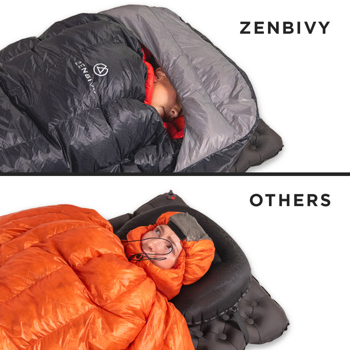 Unlike a traditional backpacking quilt + straps combo, Zenbivy sheets feature an integrated hood to insulate your head. Sheets are available in insulated styles for full mummy bag warmth or uninsulated styles for use in warmer weather or to line with a down jacket.